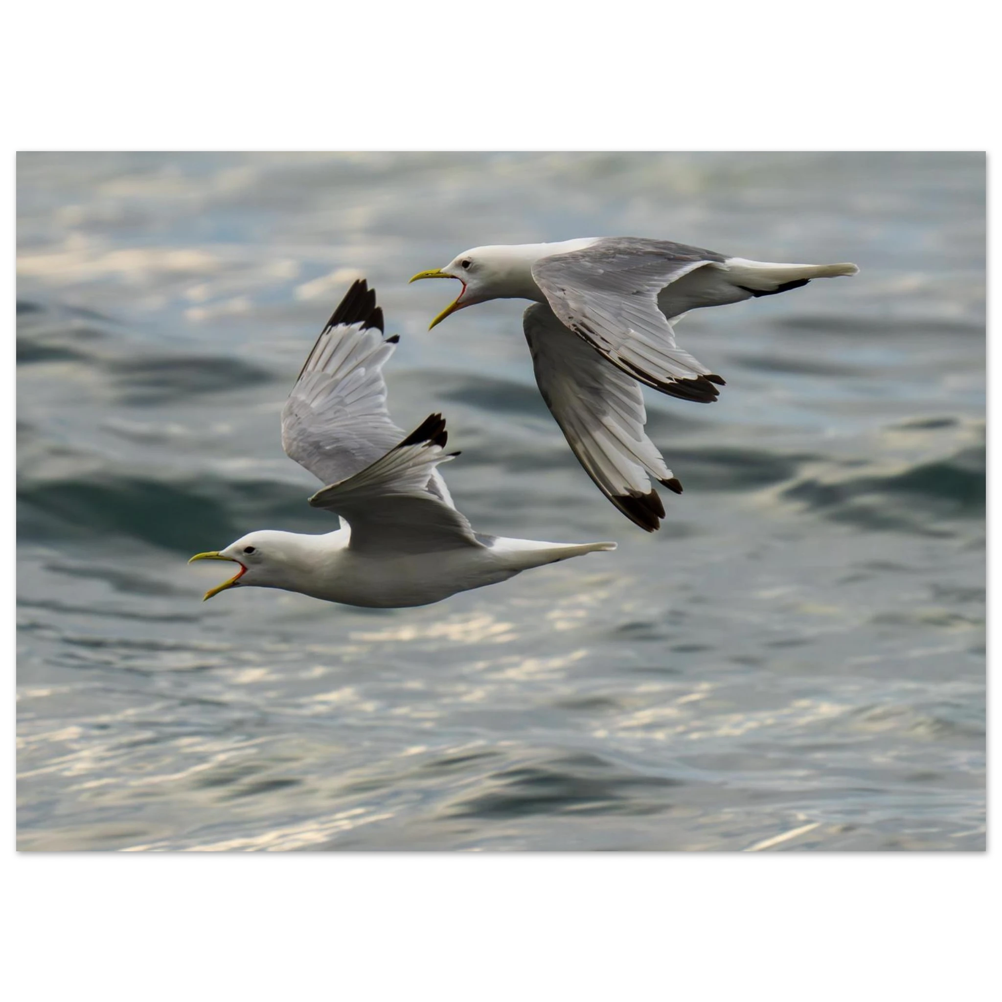 Two seabirds cross paths in open air above the North Sea, their wings suspended in a brief and quiet intersection. The moment unfolds naturally, without pause, as each bird continues its course through the coastal wind.