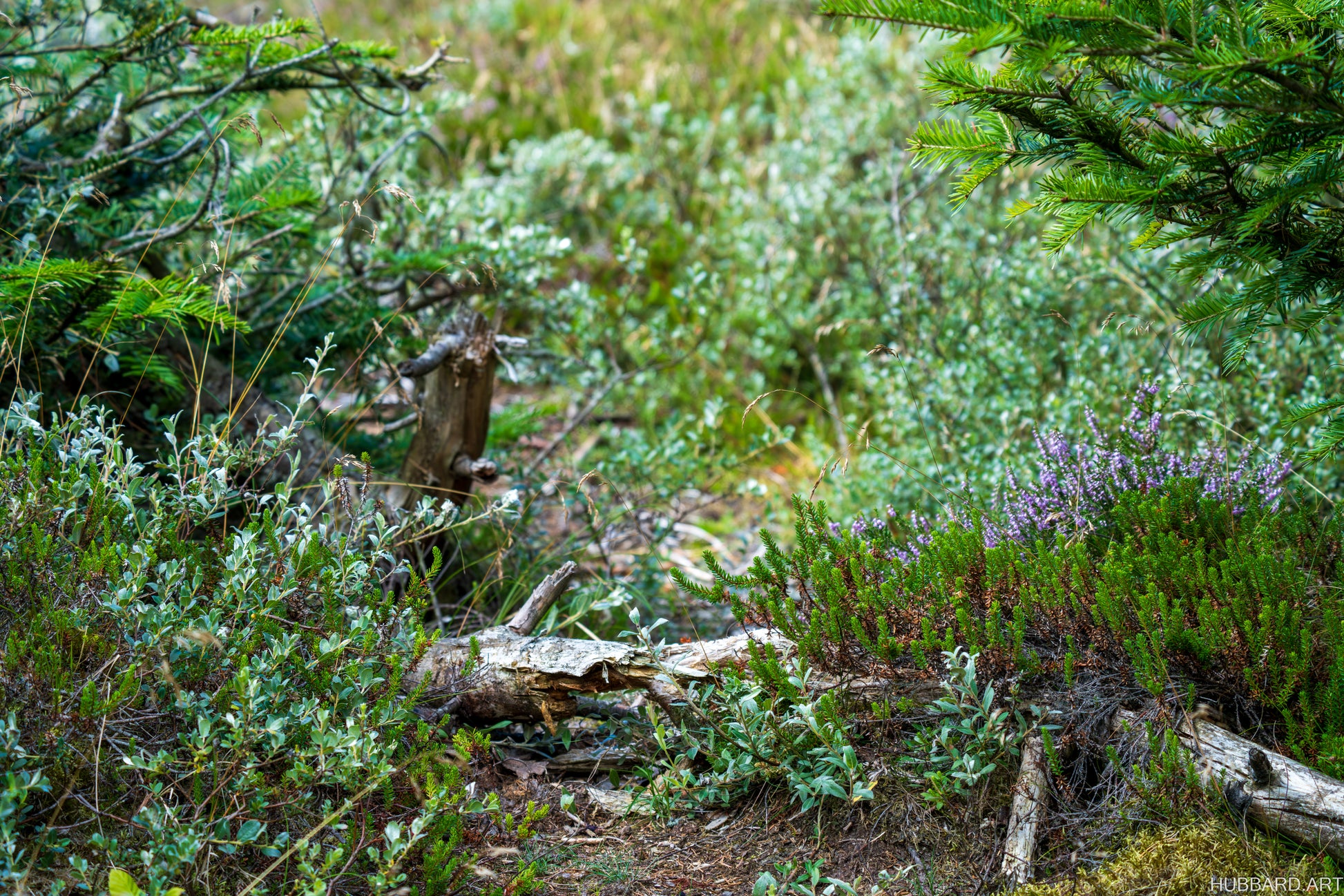A quiet moment beneath the trees — fallen wood, soft moss, and late-season heather resting in stillness.